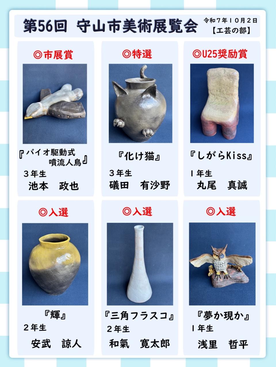 本校陶芸部が「第56回守山市美術展覧会」に作品を出品し、見事入賞・入選を果たしました。
