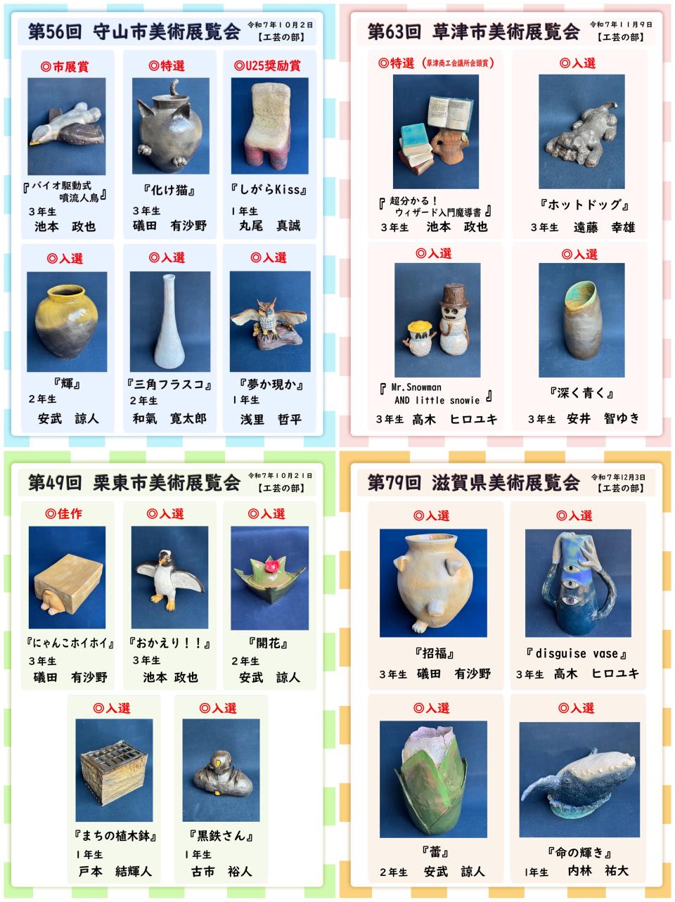 2学期には、各市美術展覧会および滋賀県美術展覧会において、本校生徒が入賞・入選を果たしました。