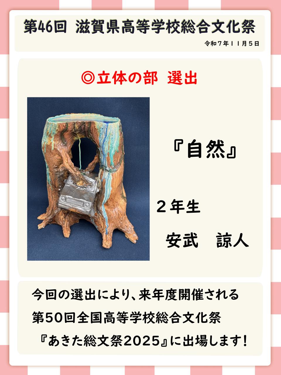 また、第46回滋賀県高等学校総合文化祭〈立体の部〉においては、本校から1名が選出されるなど、日頃の制作成果が高く評価されました。